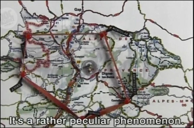 当你独自在山中大声喊叫,山里有回音传来。所以要在前阿尔卑斯地区南部拍摄犯罪的疯狂——那里平均每平方公里只住着不到一个人——你就不能像诺那样直接拍摄犯罪,而是要创造一种回声,一种延展着那些孤独的枪响的回声。这回声是什么呢?就是橡皮筋弹响的声音。这部电影的核心是一个被五个图钉固定的橡皮筋张成的五边形。此图形的五个顶点分别是卡斯泰朗(Castellane)、蒙克拉(Montclar)、罗桑斯(Rosans)、索(Sault)和坎松(Quinson),它们圈定了前述的“疯狂之土”。每次慕莱触碰地图,在镜头结束前他都会“啪”的一声弹响橡皮筋。