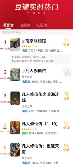 除了第一名是电影《南京照相馆》,第二名是凡人真人剧,第三名是凡人动画电影,第四名是凡人小说,第五名是凡人动画剧......IP魅力在这一刻毋庸置疑。