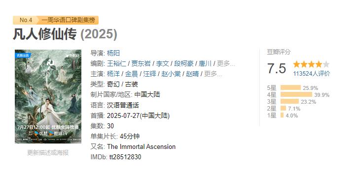 剧版《凡人修仙传》开播⾸⽇热度达8326,创下优酷2024年以来开播⾸⽇热度最⾼纪录;播出第三天热度值即破万。