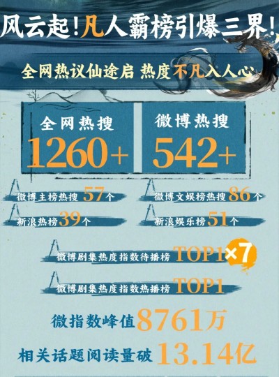 “凡人”微博相关话题阅读量累计已突破惊人的百亿大关,使其成为唯一一个同时在剧集、动画、电影、周边等领域实现全产业链突围的现象级IP。