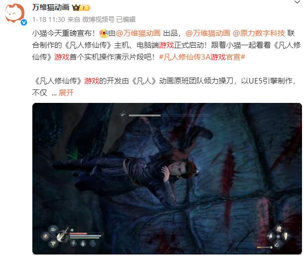 万维猫团队已正式启动《凡⼈修仙传》3A级单机游戏的开发。