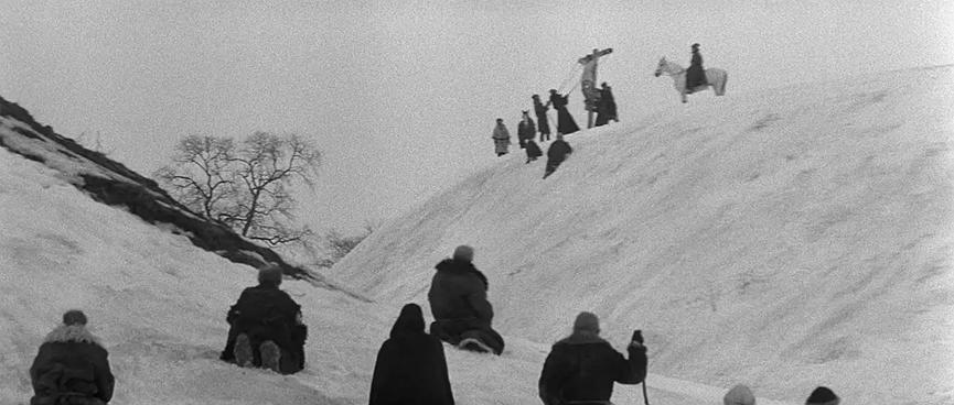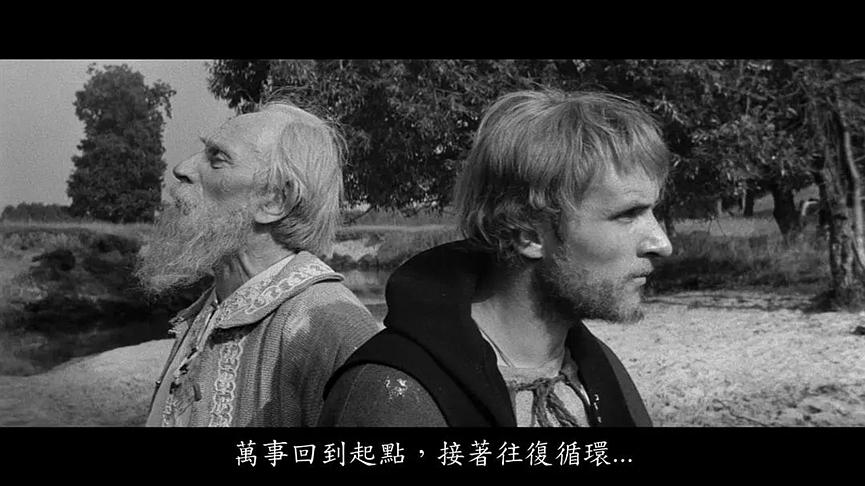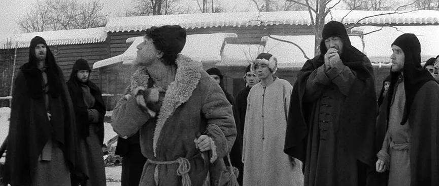 《安德烈·卢布廖夫》是塔可夫斯基作品中相对枯燥、无聊的一部,可能很多人提及塔可夫斯基就是他对以俄罗斯东正教为代表的宗教的虔诚信仰,实则不然,塔可夫斯基绝对不是耶稣一般的艺术基督,他是向固有教条发起反叛的现代教士,以其艺术创作重构信仰体系,以生而注定的使命感救赎现代人的精神世界。《卢布廖夫》也不是一部如祈祷仪式一样神圣的宗教电影,它带有深深扎根于人民、大地与自然的朴素情感,并以之为根基构建起只属于其本人的电影艺术信仰——“雕刻时光”,这些才构成了整部电影想表达的“命定的背叛”(所以我认为观看这部电影不需要过多的宗教学知识,只需要掌握对宗教教条的常识性认识即可)。